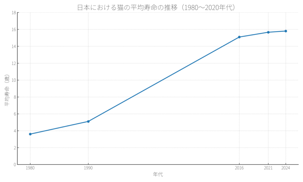 キャットフードが普及し、近代的な猫の食事が確立された1980年代以降、猫の平均寿命は驚くべきスピードで延びています。